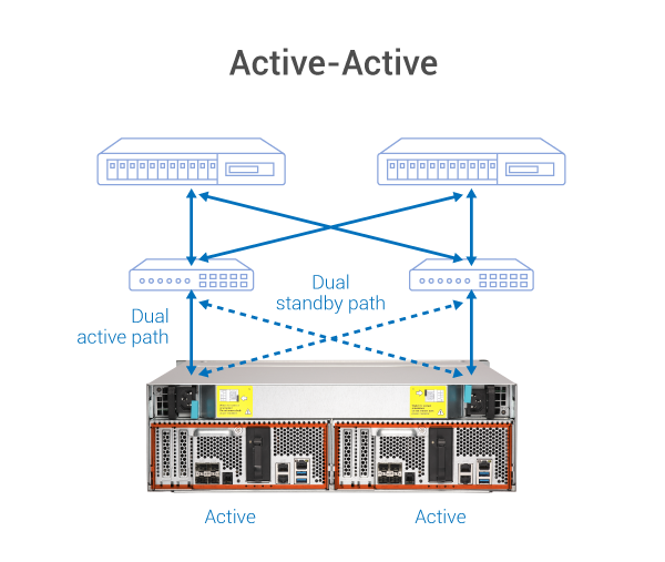 Aktif-Aktif depolama sistemi mimarisinde, her iki denetleyici de eksiksiz bir hizmet yelpazesi sağlayabilir; bu, tek denetleyicili sistemlerin Aktif Bekleme mimarisinden farklıdır. Aktif-Aktif mimarisinin boşta bilgi işlem kaynakları gibi bir dezavantajı yoktur. ES1686dc Active-Active denetleyici mimarisinin güçlü yönlerinden yararlanmak için birden fazla depolama havuzu oluşturulması ve bunların sahipliğini her iki denetleyici arasında dağıtmanız önerilir. Bu, daha iyi yük dengeleme için her iki kontrol cihazından eşzamanlı çıkış yapılmasına olanak tanır.
